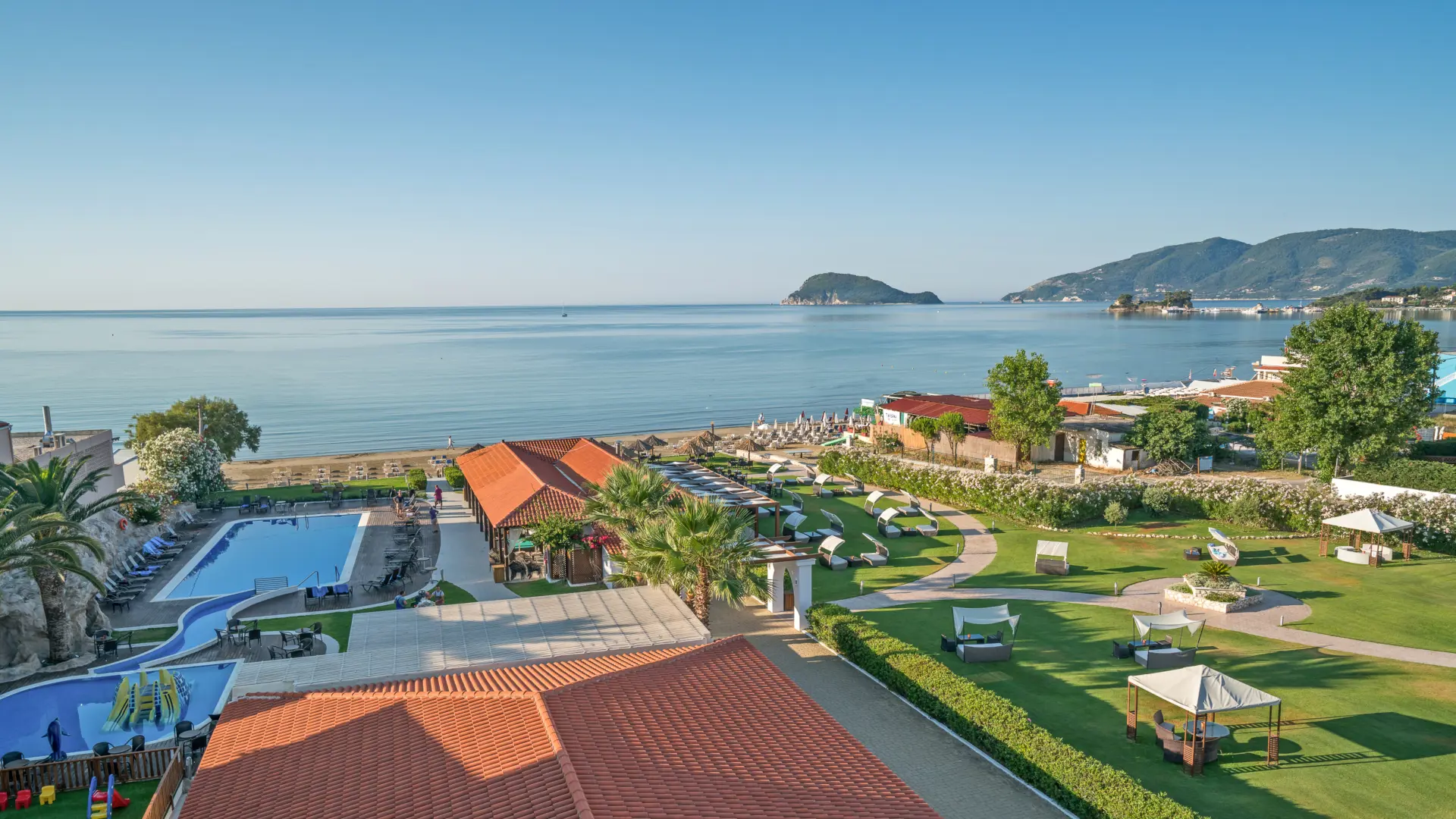 Hotellet har den bedste beliggenhed i flotte omgivelser med grønne områder og eksotiske palmer og direkte ved den skønne, lange sandstrand i Laganas. Fra solterrassen er der en vidunderlig udsigt over havet. Hotellet er særdeles familievenligt med gode børnefaciliteter og et højt serviceniveau.
