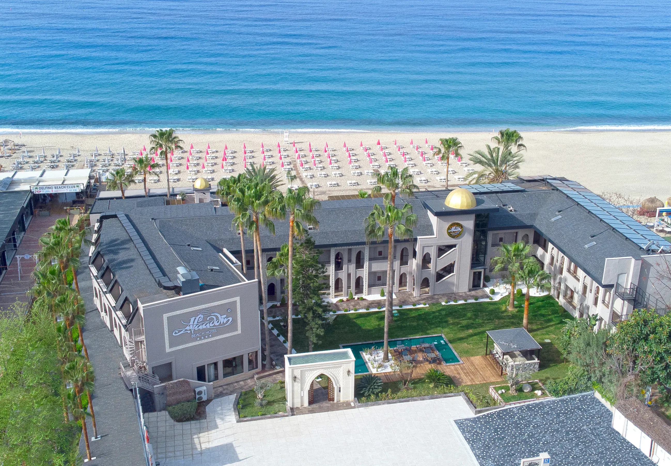 Hotel Alaaddin Beach er et lækkert voksenhotel (+18) og et af Alanya’s bedst beliggende hoteller, direkte ved den populære Kleopatrastrand og blot 2 km. til centrum.