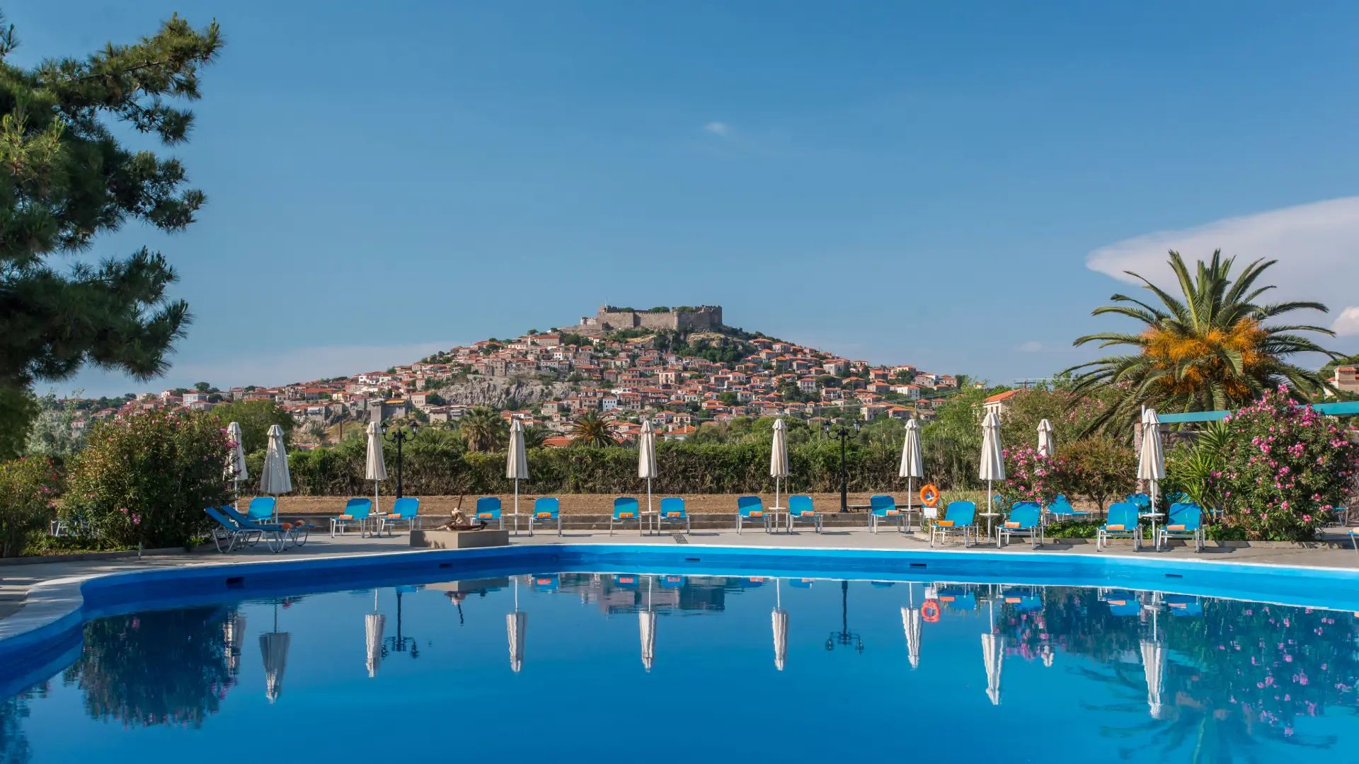 Lige ved stranden og med den mest fantastiske udsigt til både det Ægæiske hav og borgen i Molivos ligger Delfinia Hotel. Hotellet har et stort poolområde med direkte adgang til en af områdets skønneste stenstrande. På blot 20 minutter kan du gå ind til centrum af Molivos, hvor du finder et hav af små hyggelige restauranter og barer.