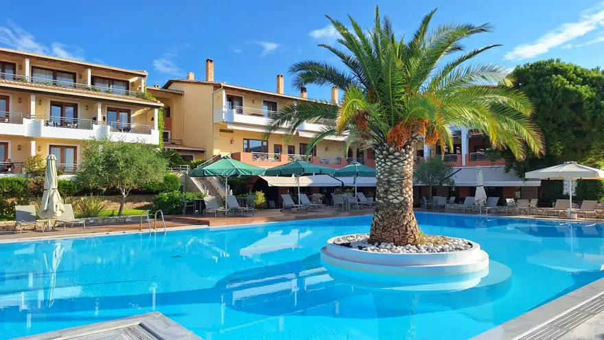 Idyl er meget vel det første ord, der falder dig ind, når du kigger ud over hotellets have, hvor den turkisblå swimmingpool står i smuk kontrast til de mange grønne planter og blomstrende bougainvillea, der vokser op ad bygningerne. Det er en skøn oase, hvor swimmingpoolen nærmest ligger på stranden – kun adskilt af enkelte træer, hvor du kan søge skygge og nyde udsigten over havet og det græske fastland.