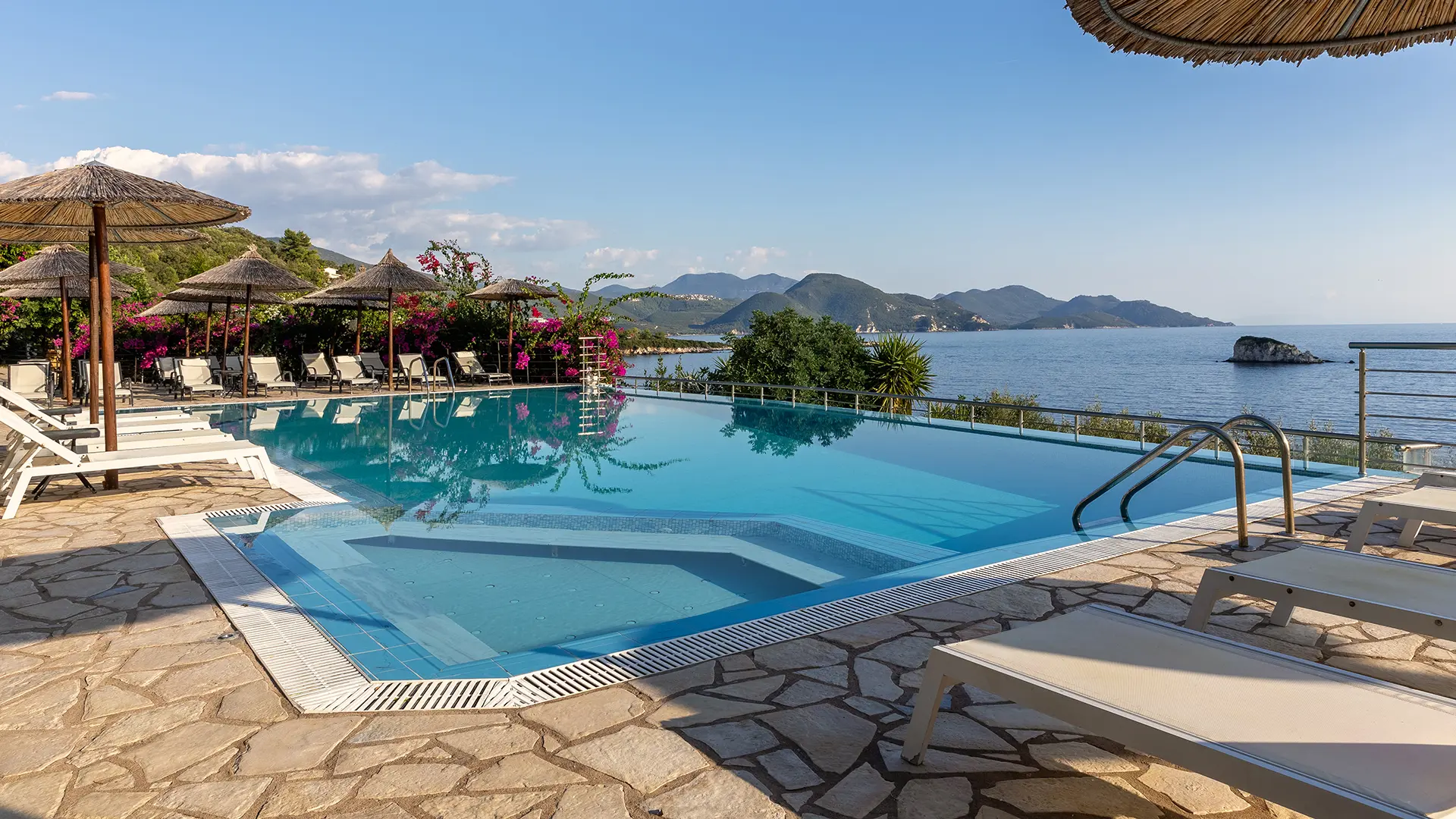 Skønt beliggende hotel ved Græske Riviera med panoramaudsigt, pool, solterrasse og privat havadgang for en luksuriøs ferie.